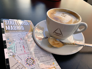 From previous visits to Madrid, I was familiar with a few large avenues, so I was on my own and the weather was perfect. When I decided to scope out the AirBnB I had rented for the week, I got turned around and was completely lost for about 90 minutes. I had time to waste…but my feet and legs were not happy after pushing them for six miles. And I had been awake for too many hours to calculate with my math abilities. But I found more energy and a roadside table near the Plaza Mayor where I spent the rest of the afternoon with a café con leche, caliente, en la taza. And later, I pulled all that luggage out of the storage box without knocking myself out when it came toward me and I HAILED DOWN A TAXI.